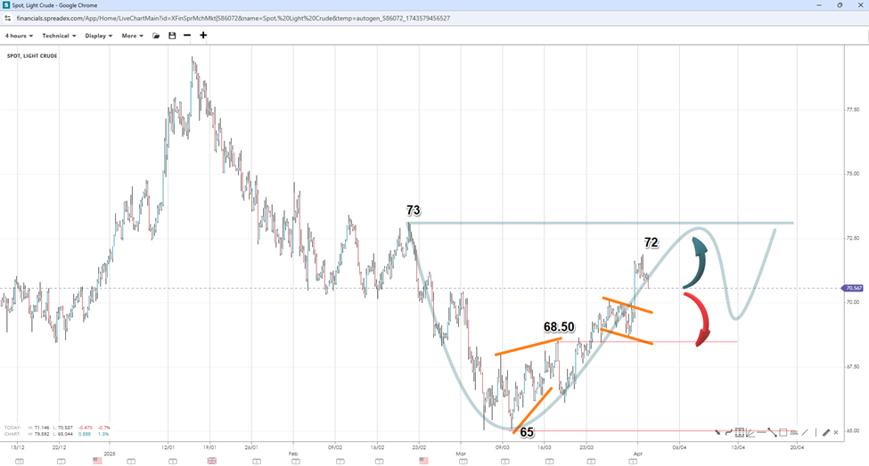 Price action in WTI suggests that a continuation to $73 could form the cup of a cup-and-handle (C&H) pattern, which would lead to a pullback to form the handle. Since the reversal followed a wedge pattern, the odds of further upside remain favourable. However, with a regional top forming at $72, if WTI falls below the wedge top of $68.50, it could weigh on prices and potentially trigger a drop towards $65 again.