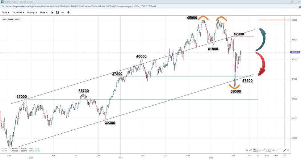 After completing a double top pattern in February, the Dow Jones has slid to channel support around 37500, potentially completing the bearish correction. If bulls can recapture 41800, they could open the door to 42900, the upper channel trendline near 44000, and eventually attempt new peaks above 45000. However, if the dollar continues its ascent and prices fall under the 40000 handle again, this will expose 37800 and 37500, risk sliding under the channel and 36500 low, and ultimately raise the risk of a bear market to 35700, 35000, and even lower to 32300.