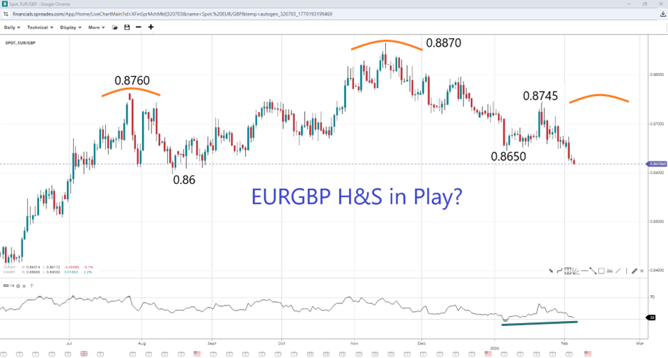 Markets see the BOE as slightly more dovish than the ECB, with one rate cut in Britain priced in this year, compared with none on the continent. However, recent inflation trends show consumer prices easing in the Eurozone, while in . This has allowed the pound to gain a little against the euro, causing the EURGBP to slide a bit in the latter part of January. Traders will be assessing the shifting odds of rate cuts following the BOE and ECB meetings on Thursday to better gauge the pair's direction. The recent weakness in the dollar has made the , adding disinflationary pressure, which isn't as much of a problem for the BOE, with inflation still above target.