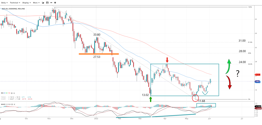 NIO’s share is in a bear market but a recent attempt above the 50-day average of $18.10 could change the stock’s outlook. The 200-day of $20.45 will have to be recaptured to gain any real confidence a turnaround is afoot.