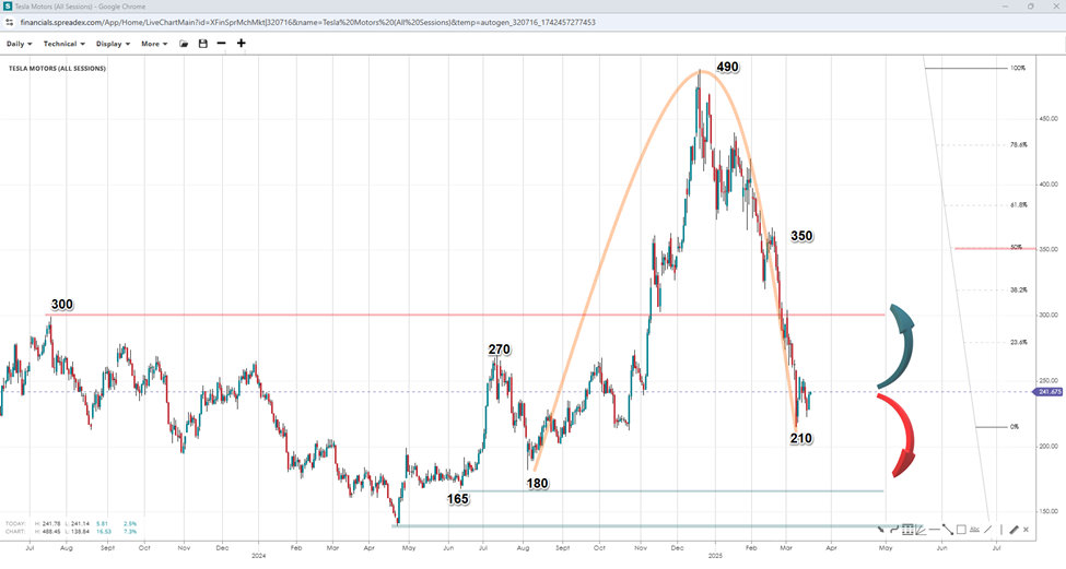 Tesla has declined over 40% this year as CEO Elon Musk was caught in political controversies, but investors remain focused on fundamentals and expect future revenues from AI capabilities. However, the company's valuation remains high, making it susceptible to risk-off sentiment. Tesla also faces challenges in sales, with drops in Q1 deliveries in the US, Europe, and China. Although a correction is likely, the V-Top pattern points to short-term downside risks unless TSLA moves past the 50% Fibonacci retracement.