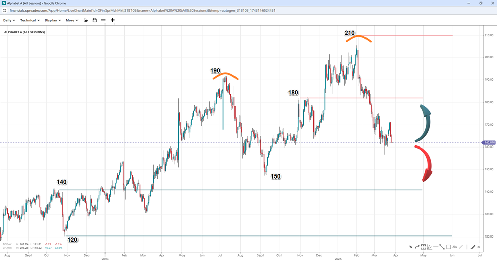 The formation of a V-top pattern in Alphabet’s price chart raised the possibility of a potential decline to $120 if $140 gives way to bearish price action. However, a head-and-shoulders pattern could also form instead, with the neckline support at $150 offering a bounce towards the right shoulder near $190 if $180 breaks.