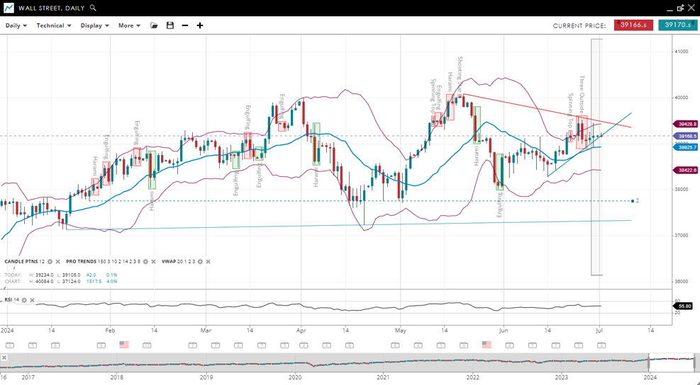 Wall Street has made significant upside progress in the past 3 months - moving into a bullish consolidation phase, with the price recently increasing to 39,168, now above the VWAP of 38,925. Support and resistance levels have adjusted to 38,422 and 39,428, respectively. The RSI has decreased to 55, signaling a slight decrease in bullish momentum compared to the previous report.