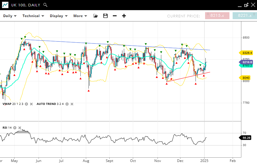 The UK 100 index remains neutral within its long-lasting consolidation phase, trading at 8,218, slightly above the VWAP (20) of 8,183. Support is at 8,040, with resistance at 8,326. An RSI of 55 signals moderate momentum, hinting at slight bullish tendencies within the range.