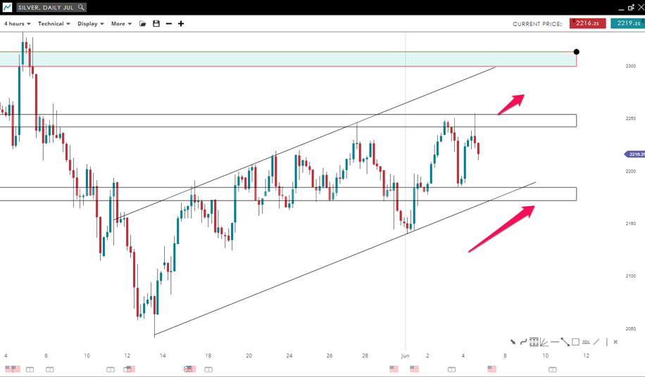 The price of silver is trading inside a bullish channel formation. The market failed to break the 2,245 mark to the upside where it faced a strong rejection from the resistance level. The price is now approaching the same zone with good momentum. If it succeeds to break the 2,245 level to the upside and close above it, we can see silver reaching the 2,310 mark.