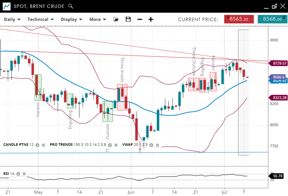 Brent Crude remains in a bullish trend and continues in an impulsive phase albeit with a downturn in the last few days to just above the VWAP of 8,323. Support has adjusted higher to 8,323.28, while resistance has increased to 8,729.57. The RSI has turned lower to 55.70, indicating a lack of strong bullish momentum.