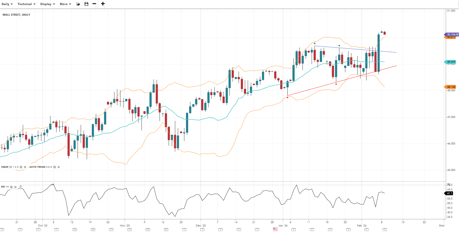Wall Street has pushed through the key 50k level and is now trading above the VWAP, showing renewed bullish momentum with RSI climbing back over 60. Price is consolidating near resistance as buyers maintain control of the broader uptrend.