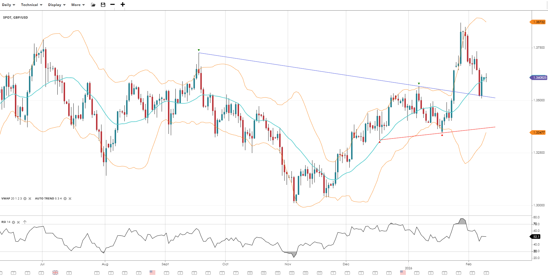 GBP/USD remains bullish after a deep pullback, holding at the VWAP near the 1.37 level with support now elevated to 1.335. Momentum remains positive with RSI just above 50, though it has cooled from overbought levels. The uptrend structure stays intact.