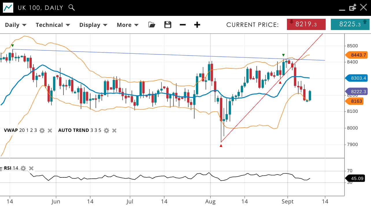 UK 100 remains neutral, continuing its consolidation. The price is at 8,222, below the VWAP of 8,303. Support is at 8,163, and resistance at 8,443. RSI at 45 shows stable momentum.