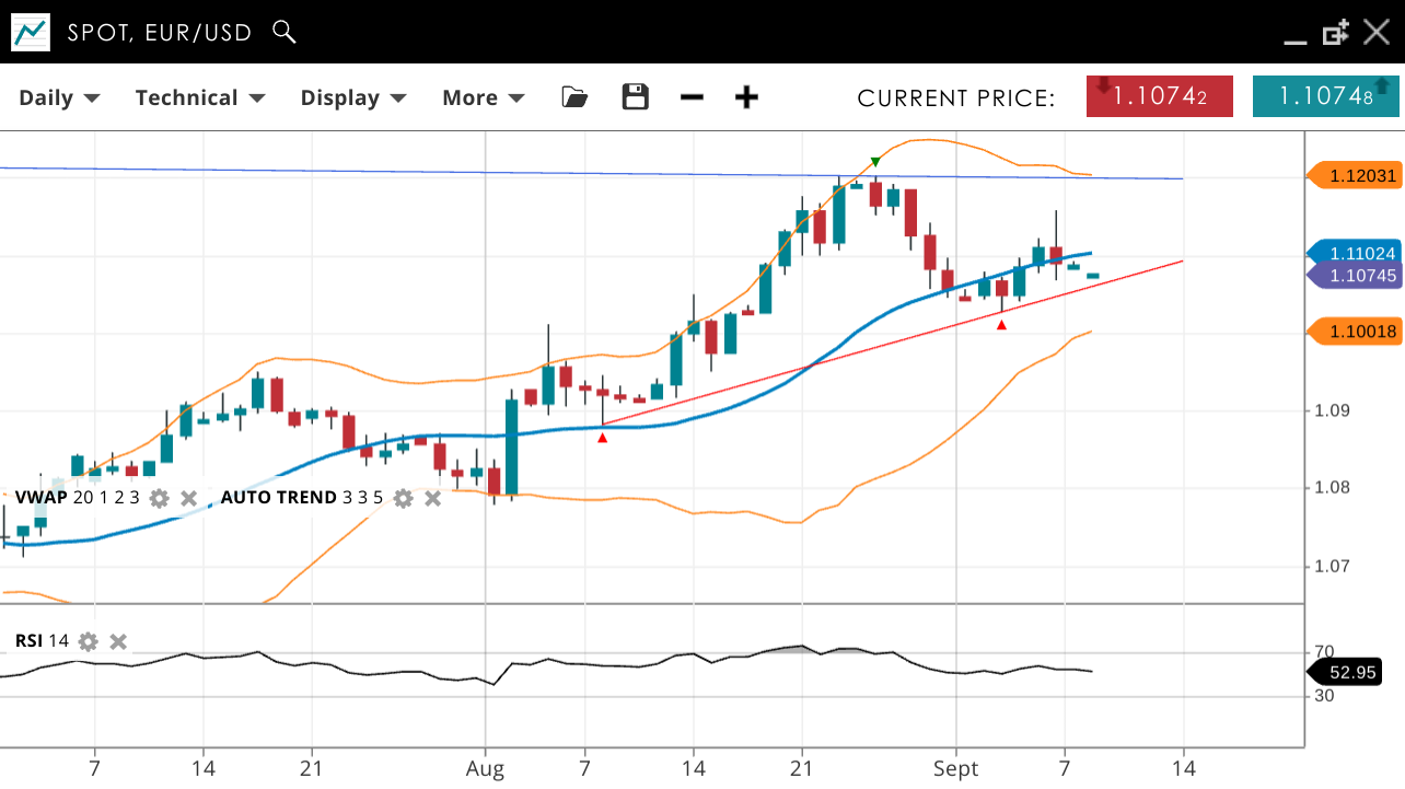 EUR/USD stays in a bullish trend, but in a corrective phase. The price is 1.1074, under the VWAP of 1.1102. Support and resistance are at 1.1001 and 1.1203, respectively. RSI is at 53, indicating a potential for consolidation.