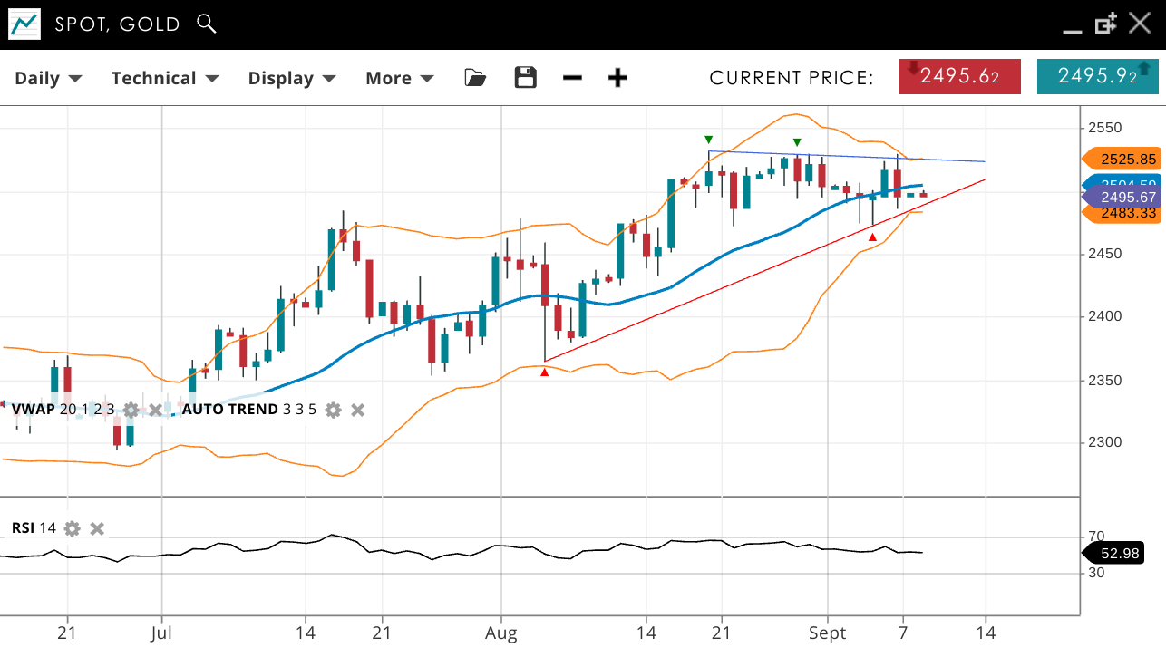 Gold remains bullish, now in a corrective phase under a shallow down-sloping resistance. The price is 2,495, close to the VWAP of 2,504. Support is at 2,483, with resistance at 2,525. RSI is at 52, showing balanced momentum.