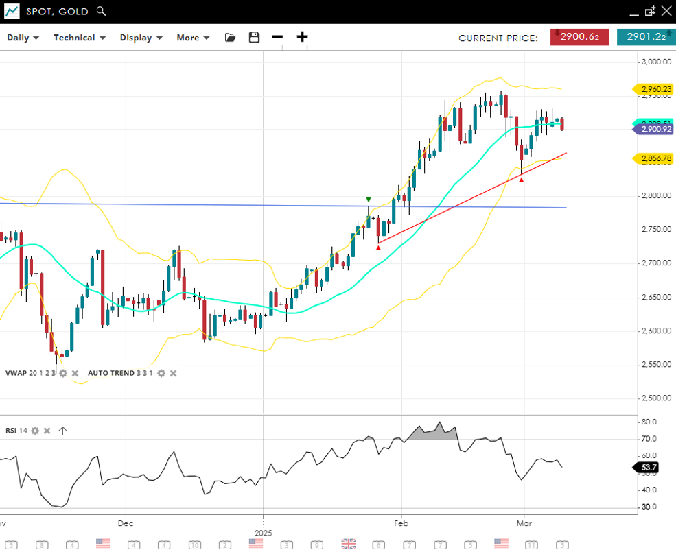 Gold remains bullish overall but is currently in consolidation, with its price at 2,901 matching the 20‐day VWAP of 2,901. The RSI at 54 reflects steady momentum, less bearish than last week. Support is located at 2,857, while 2,960 is the next resistance to confirm a renewed upswing.