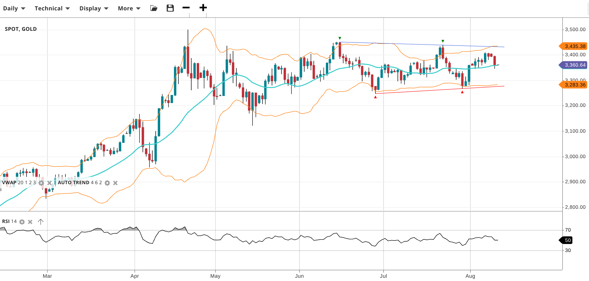 Gold remains in a neutral range, with price at 3,361, matching its VWAP and right in the middle of the range. The RSI at 50 shows a balanced market outlook. Support is at 3,283 and resistance is at 3,435.