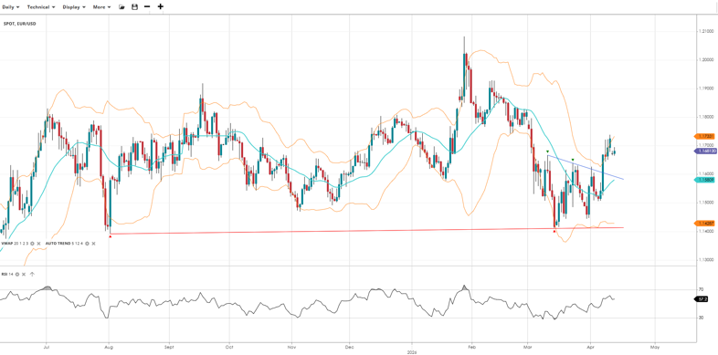 EUR/USD has broken above a short term inverse H&S pattern which formed at the bottom of its long term range near 1.14. Price has rebounded strongly through the VWAP and is pressing toward upper resistance near 1.1733. The RSI at 57 reflects recovering bullish momentum. A sustained break above the upper band would shift the near-term bias decisively higher, while a break of 1.14 would open up a new long term downtrend.