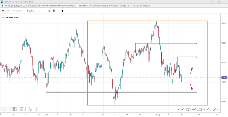 A sideways consolidation may be underway in Germany 40’s index, clearing the way to 15500 but keeping the door to 16500 also open. Short-term price action suggests a flag-like consolidation, with the next support at 15620 and resistance above 16070 at 16250.
