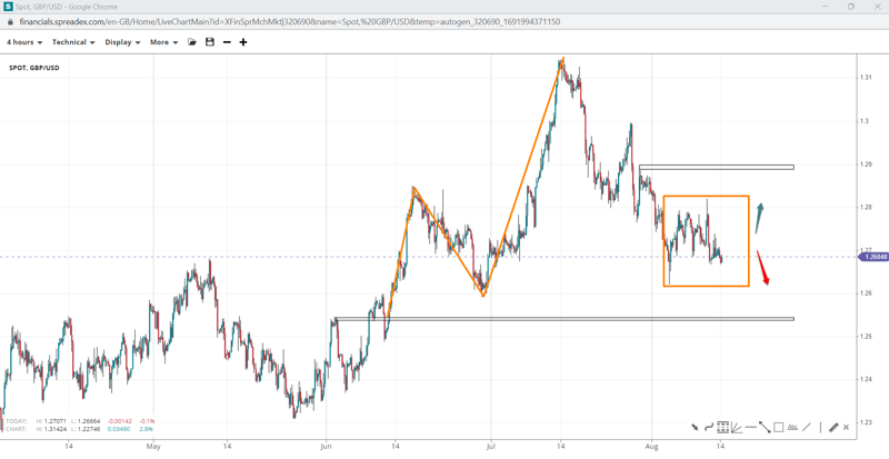 Cable also appears to be forming a potential H&S pattern, pending a double bottom formation at $1.26 before potentially rising to $1.2850. Losing either of the levels will likely invalidate the pattern, increasing the chances of revisiting $1.2545 or $1.29. Short-term price action reveals a range.