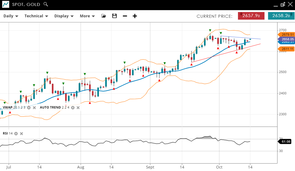 Gold continues to be bullish and in an impulsive phase. The current price is 2,658, above the VWAP (20) of 2,645. Support is found at 2,611, while resistance is at 2,679. The RSI is 61, showing steady bullish momentum.