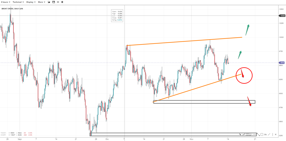 Brent is trading within a possible rising wedge with only an upward leg left to complete the pattern. Getting past the previous high at 99.50 will offer technical completion above or at 100.00, with the upper trendline an actual top before a pullback. If the bottom trendline near 93.00 breaks instead, 90.00 is short-term support above 88.00 and the primary floor at 82.50. If the pattern fails, 105.00 could be seen.