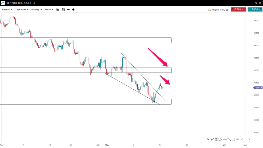 The Nasdaq 100 index is still moving lower, but the breakout from a descending wedge formation to the upside has offered some relief. An extension of this rebound to the 13,000 could present a new opportunity for sellers to short the index at a better risk:reward around the 11,765 mark.