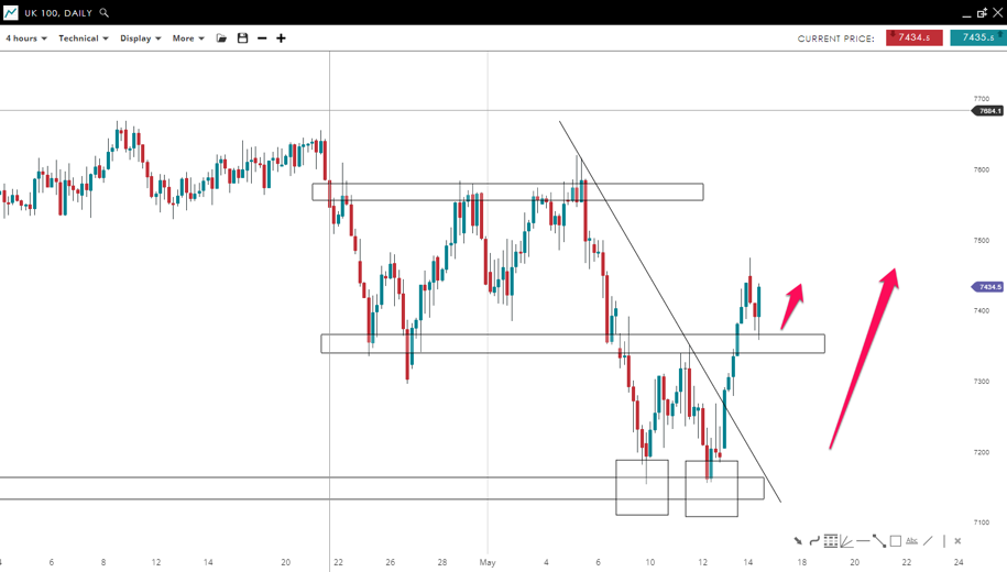 The index failed to break the strong support around the 7,150 mark where it posted a double bottom. This led to a reversal and a move higher after breaking the bearish trend line to the upside, and in addition the resistance level (now support) has been breached around 7,350. A lower correction has been posted to this level already, setting up a possible move higher in the coming days.