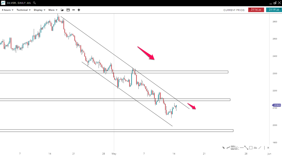 The price of silver is in a downtrend inside a bearish channel pattern, signalling that the sellers are in clear control of the market. The market is heading towards the upper end of the channel and pivot level around 2,150, where more sellers could join the downtrend and push the price all the way down toward 1,975 potential support.