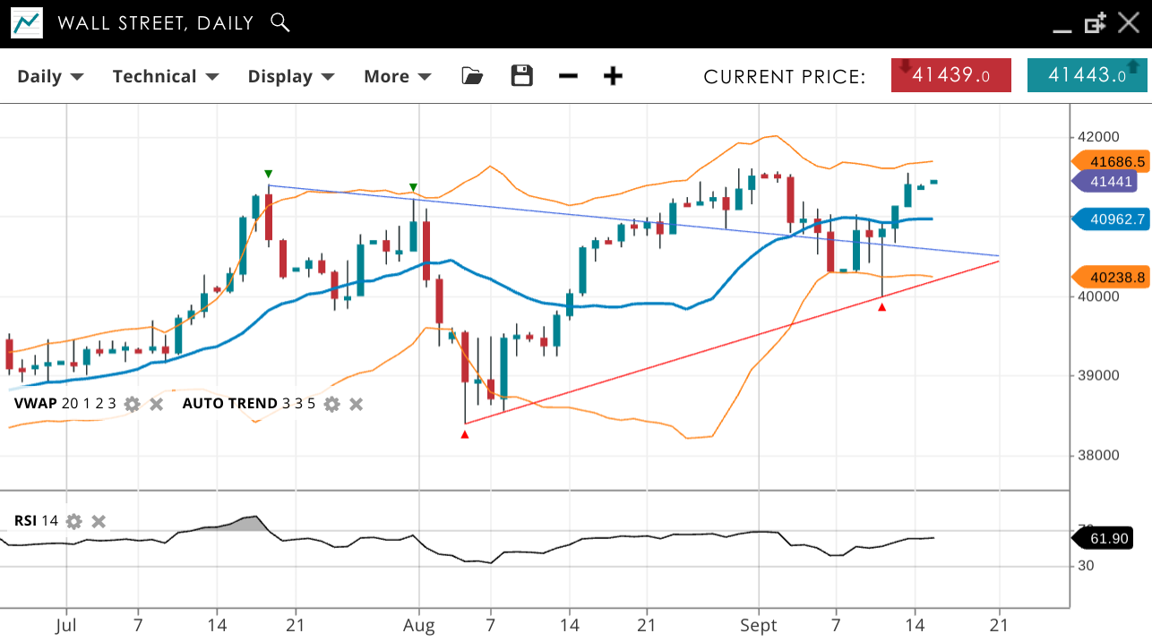 Wall Street remains in a bullish trend, now in an impulsive phase. The price is 41,441, above the VWAP of 40,962. Support is at 40,238, with resistance at 41,686. The RSI of 61 indicates strong bullish momentum.