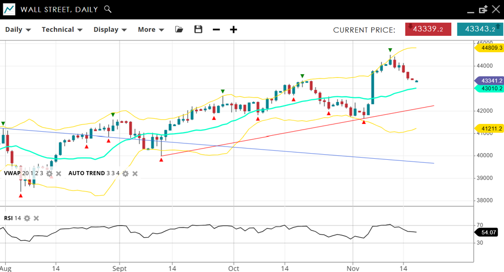 Wall Street remains bullish but has moved into a correction phase, trading at 43,343, marginally above the VWAP (20) of 43,341. Support is at 41,211, while resistance lies at 44,809.3. The RSI at 54 shows strong momentum but signals potential consolidation before further advances.