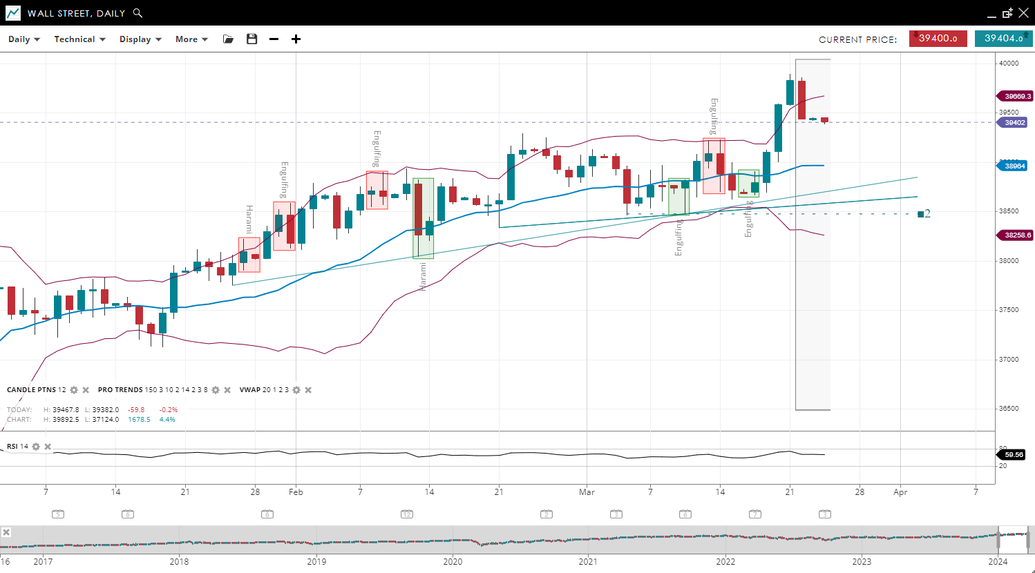 Wall Street | Bullish | Impulsive | 39402 | 38964 | 38258 | 39669 | 59 |