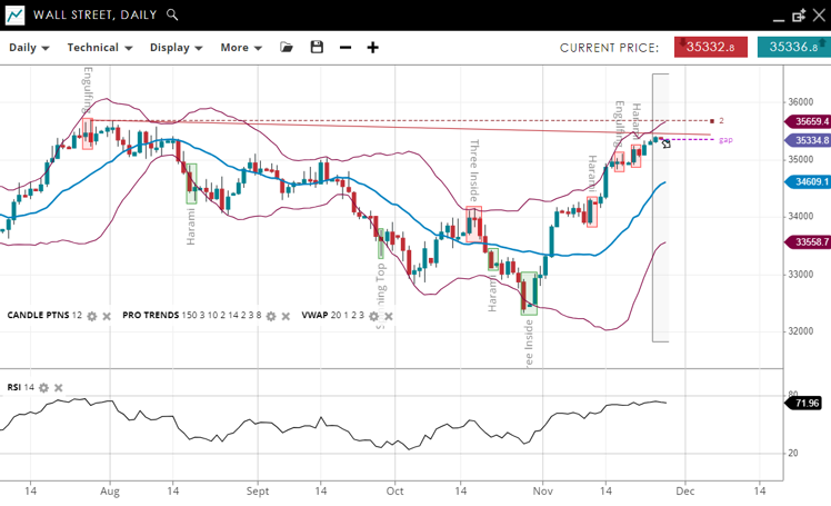 The index is in a bullish trend, with the VWAP moving upwards. The last candlestick is an Engulfing pattern, which is bullish. The RSI is at 74, suggesting that the index is in the overbought region, which may lead to a temporary retracement.
