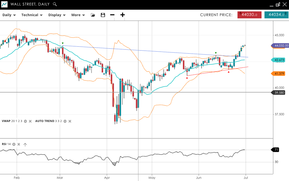 Wall Street | Bullish | Breakout | 44,022 | 42,673 | 41,379 | 44,000 | 71 |