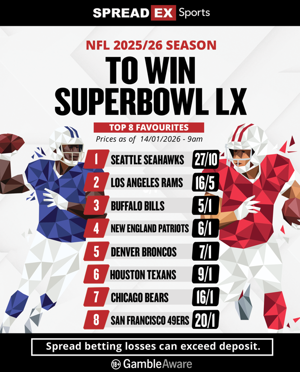 We also offer markets for fixed odds and spread betting on each individual game in the lead up to Super Bowl LX. Our markets for the Divisional Round match-ups are live now on the Spreadex site, including our individual player markets like the player passing yards market. This allows you to bet on the number of yards a player will pass for during their game. You can back reigning MVP Josh Allen to pass for over 275 yards in his game against a strong Denver defence at 7/2. You can also back New England’s sophomore star Drake Maye to have over 275 passing yards against Houston at 5/2.