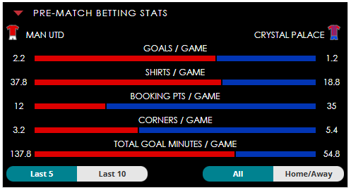 To see all the Man Utd v Crystal Palace betting stats and form, visit our pricing page to view our Pre-Match betting stats table or hover over/tap the chart image to see previous outcomes for that particular market.