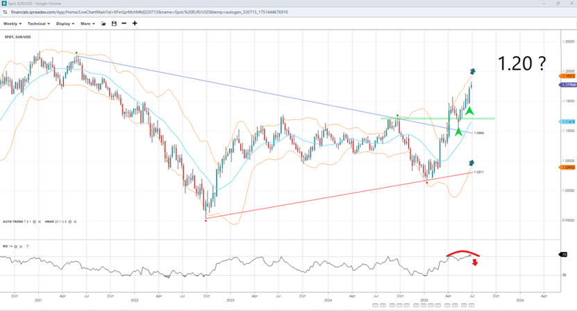 Payrolls are expected to slow down to 110,000 jobs from 139,000 in May and the average of 159,000 over the past year, with the unemployment rate expected to rise to 4.3%. Missing expectations could prompt the Fed to ease despite its insistence that the economy and job market remain strong. As risks concerning the impact of tariffs on consumers and the labour market persist, a sudden softening in labour data could cause markets to revise rate cut expectations upward and weigh on the dollar in favour of the euro.