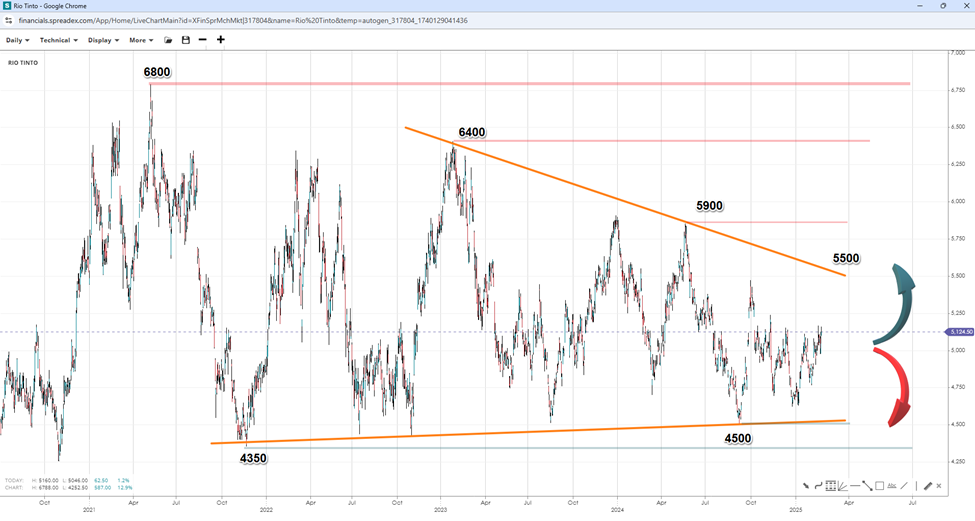 Rio Tinto has been consolidating over the past three to four years in what seems to be forming a narrowing symmetrical triangle. Near the tightest point in years, Rio may be poised for an upward breakout past 5500 and 5900 if the 4620 and 4500 hold firm, with the recapturing of 6400 opening the door to new all-time highs above 6800. Conversely, sliding under 4350 would suggest a bearish breakout, paving the way to 4k and perhaps lower territories.