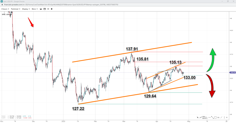 In the medium term, the low of 129.64 appears to offer a similar corrective pattern unless the move up to 135.13 is a wedge. If so, the shorter terr channel might hold potential bearish action and lead to further upside. Losing the channel low though, might open the door to 131.75 if 133.00 succumbs to potential pressure. Conversely, the break of 135.00 might see prices rise toward 138.00, provided 135.81 gives way to bulls.