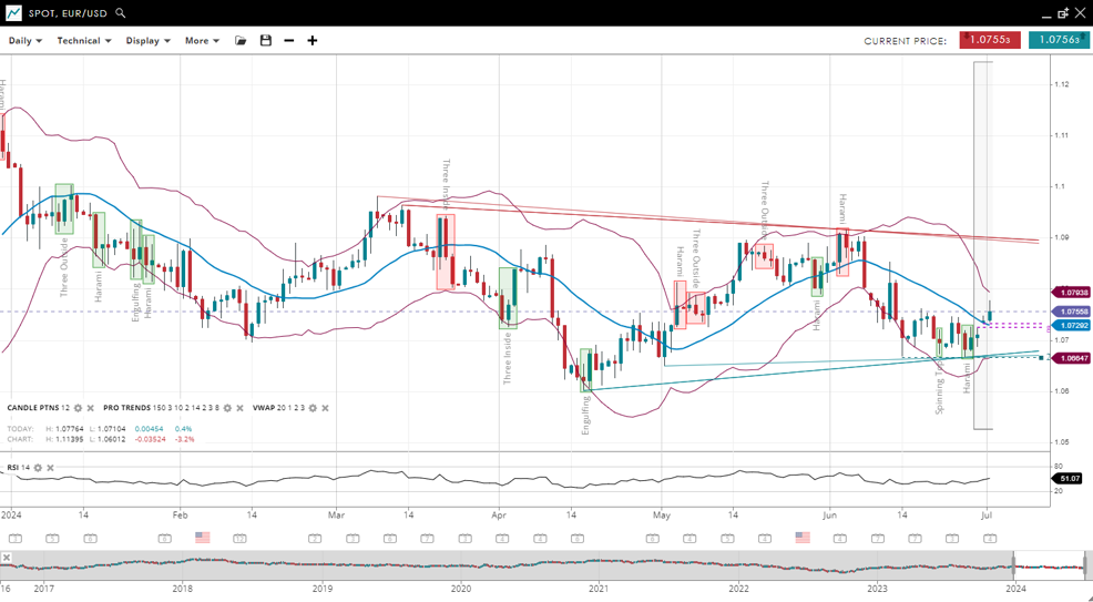 EUR/USD remains broadly trendless with the price more recently increasing to 1.0755, now slightly above the VWAP of 1.0729 - and indicating a possible new phase of weakness. Support has adjusted higher to 1.0664, while resistance has decreased to 1.0793. The RSI has increased to 51, indicating a reduction in bearish pressure compared to the previous report.