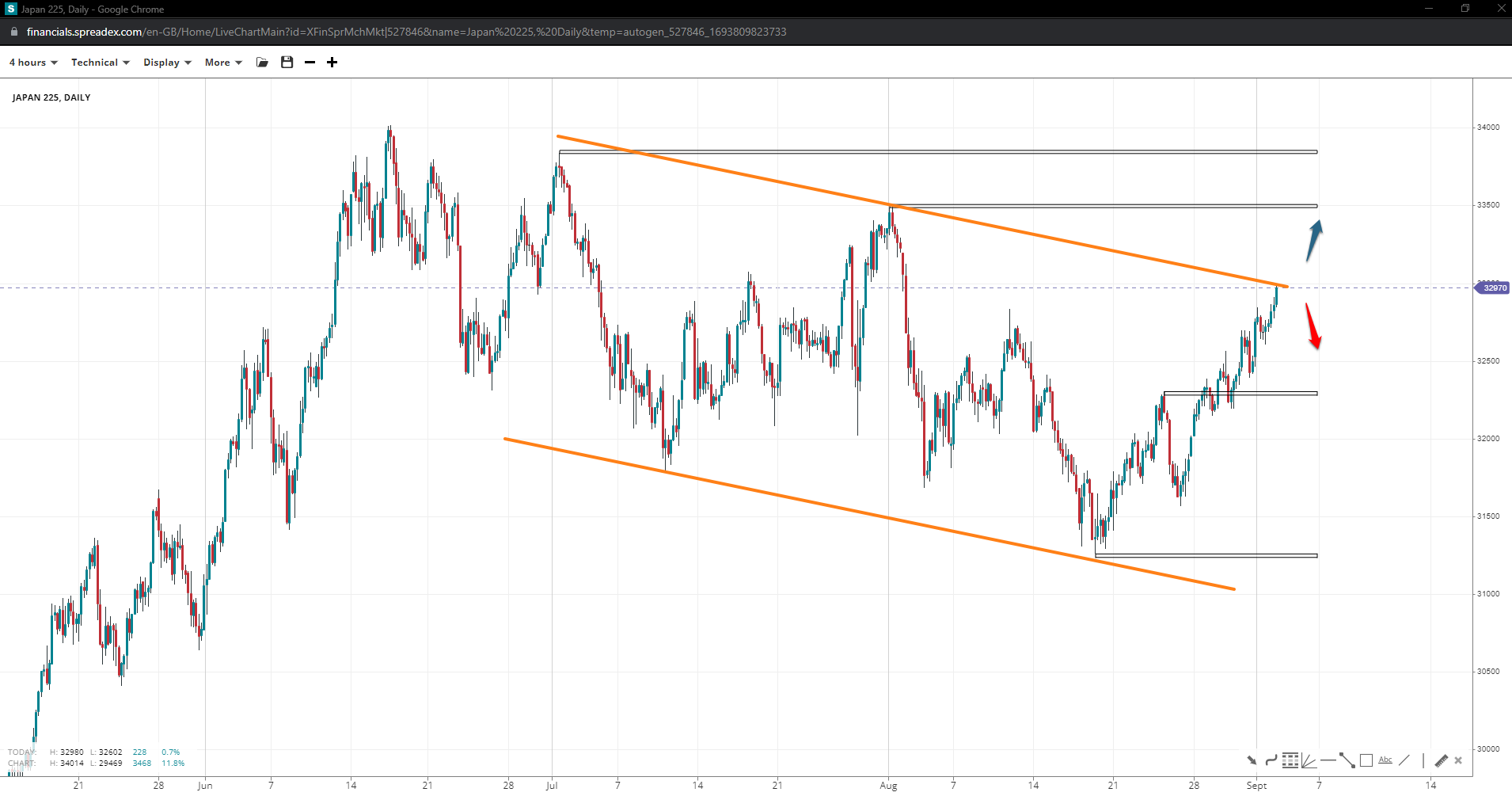 While Japan’s index appears bullish, the price remains within the ascending flag pattern unless it ended at 31250, encouraging additional upsides towards 33500 and 33850. A rejection could see the index lower down near 32300.