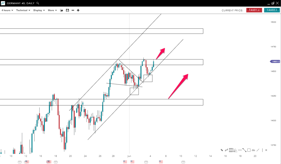 The price of GER40 broke out from a bullish pennant to the upside. This indicates that the bulls are still taking charge of the price movement. The index is trading inside a steep bullish channel where the price is trying to break the strong resistance level around 14,600 mark. If we have a breakout and a close above this zone, then we could see the price of GER40 reaching the 15,000 level.