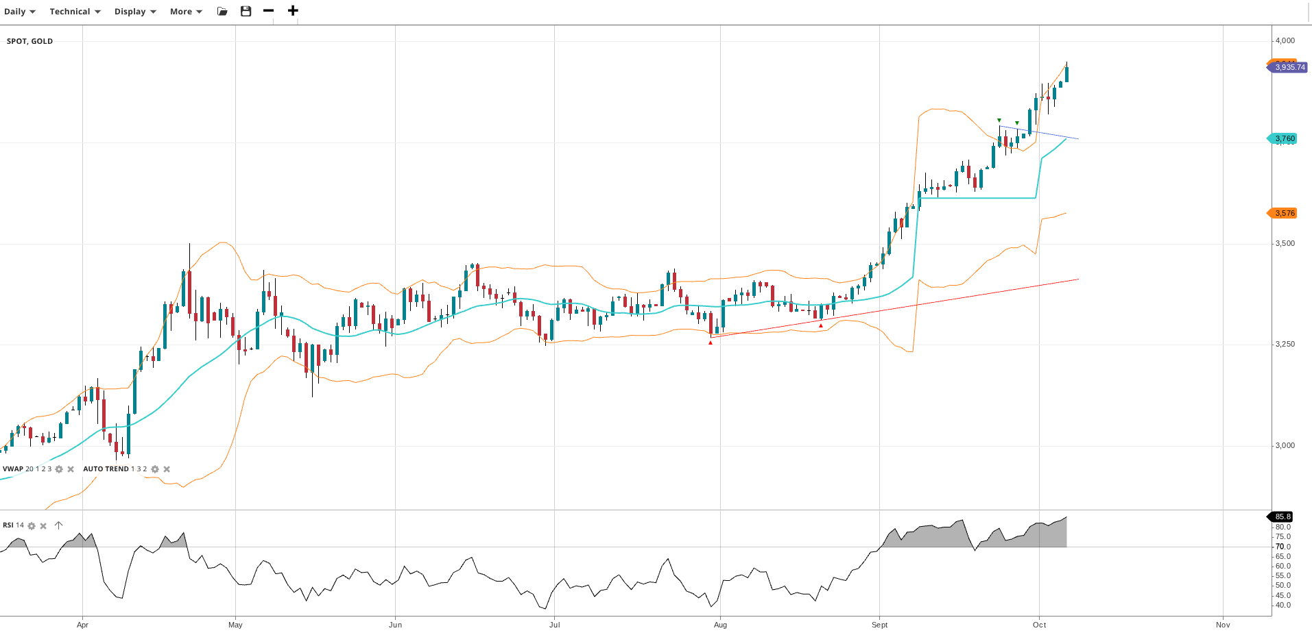 Gold continues its very strong bullish impulsive run with no signs yet of any major pullback, currently trading at 3,936 and well above its VWAP of 3,760. The RSI at 85.8 indicates extreme overbought conditions. Support lies at 3,576, while resistance is at the current high.