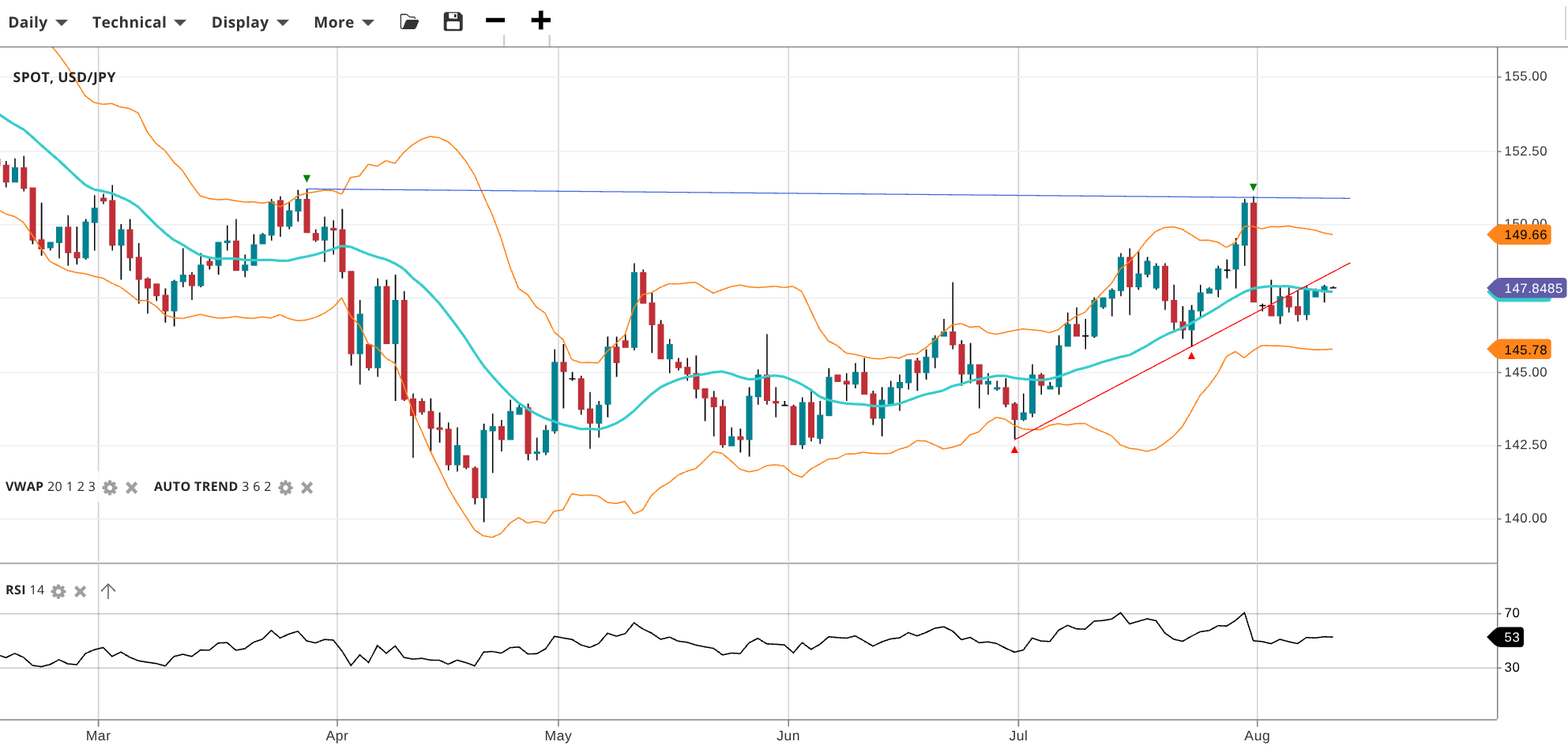 USD/JPY remains neutral in a range phase. A sharp reversal from above 150 has seen the price drop to 147.85, equal to its VWAP. RSI at 53 suggests a balanced outlook. Support is at 145.78 and resistance stands at 149.66.