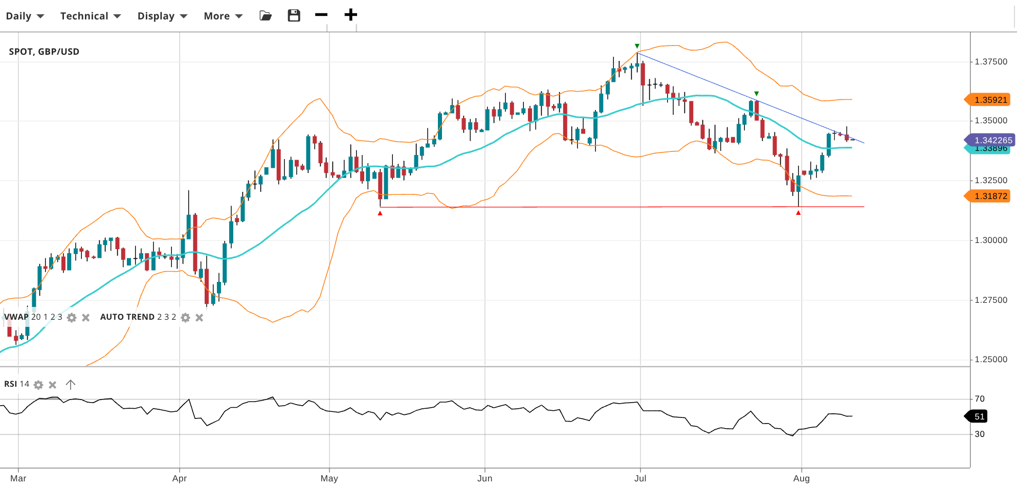 GBP/USD has rebounded within a downtrend to test the downtrend line. It trades at 1.3422, slightly above the VWAP of 1.3389. The RSI of 51 signals a balanced tone with possible upside. Support is at 1.3187 and resistance at 1.3592.