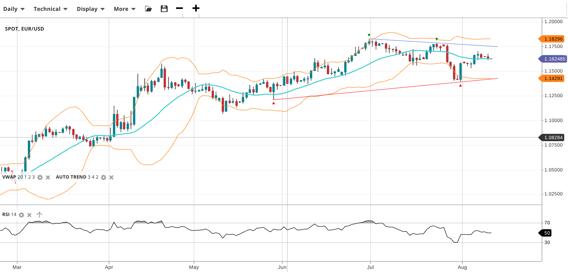 EUR/USD holds a bullish trend but is correcting within a short term trading range. The pair trades at 1.1624, exactly at its VWAP. RSI at 50 reflects a balanced market. Support is at 1.14291 and resistance at 1.18296.