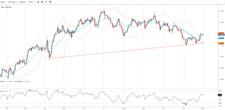 EUR/USD continues within a neutral range, having not taken out significant formers lows, trading at 1.1626 slightly above VWAP of 1.1574. RSI at 58.8 signals modest bullish bias. Support is 1.1497, resistance at 1.1652.