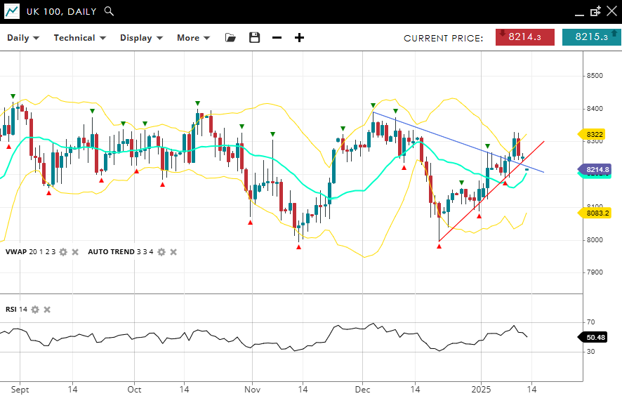 The UK 100 remains neutral within its consolidation phase, trading at 8,214, slightly above the VWAP (20) of 8,190. With support at 8,083 and resistance at 8,322, the RSI at 50 reflects balanced momentum, maintaining a range-bound outlook.