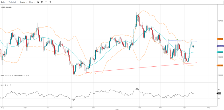 GBP/USD is rangebound near term and bigger picture, recovering sharply through the VWAP and sitting just below the descending trendline from the February highs. Price is pressing against upper resistance near 1.3502 with RSI at 54 supporting further upside. A convincing break above the upper band would challenge the broader bearish structure, while the long-term ascending support around 1.31 remains the key downside level.
