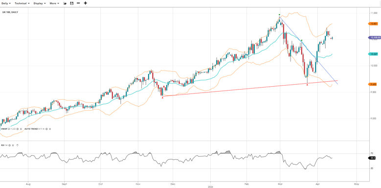 The strong rebound in the UK 100 places the overall price action in a trading range, with price trading above the VWAP and pushing toward upper resistance near 10,801. Price has broken above the descending trendline from the March highs, with the long-term ascending support trendline providing a floor below. The RSI near 59 reflects solid momentum.