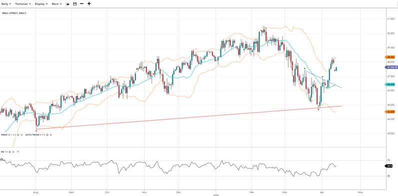Wall Street is in a bearish pullback phase, bouncing sharply off its lows and trading above the VWAP for the first time in weeks. Price has broken above the descending trendline that capped the selloff and is approaching upper resistance near 48,352. The RSI in the mid-50s reflects strengthening momentum.