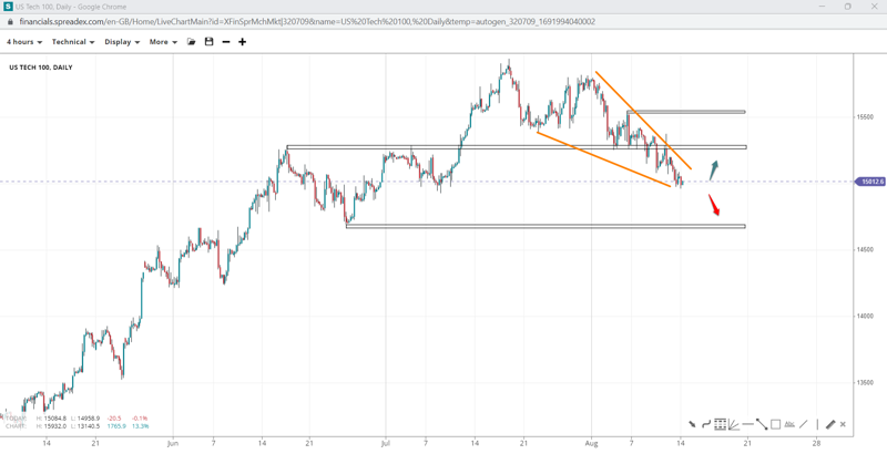 The Tech index has been declining, revealing a potential wedge down at 14650, along with a possible double bottom formation, increasing the chances of an H&S pattern. Falling under 15k will open the door to 14660, whereas getting past 15280 will increase the prospects of a 15550 breakout.