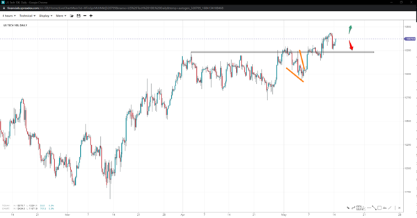 Wall Street might have put a pennant in at the 33100 support unless prices fall under 32930. In that event, the right shoulder of a potential H&S may form down at 32500. Otherwise, a move past 33780 will bring 34k and the high of 34100 back on the bulls’ radar.
