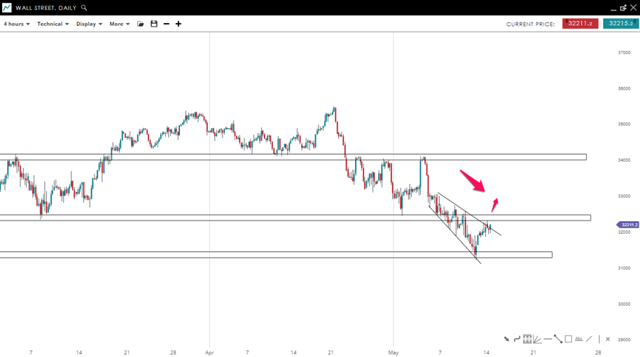 Wall Street is in a clear downward movement, however the price is trying to break out from a wedge formation to the upside. If a breakout occurs, it might test the 32,400 mark. For now, the market is still bearish unless the index can successfully close above the mentioned resistance, then the odds would increase for the trend to revere, sending the price moving higher toward the 34,100 level.